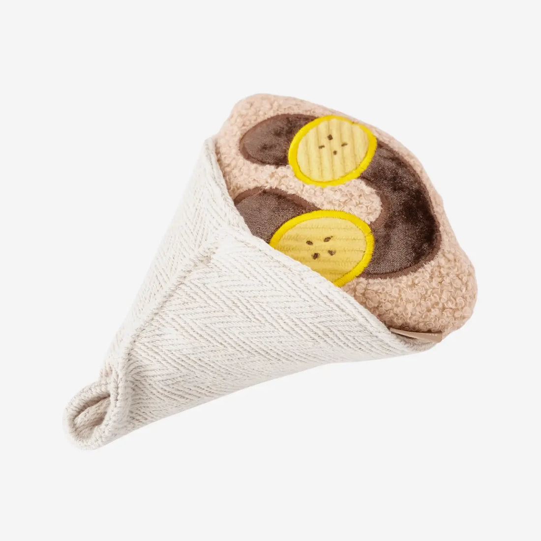 Denne fine legetøjscrepe med chokoladesovs og bananer er et sjovt aktivitetslegetøj til din hund!Mellem crepen...