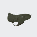 Soft and waterproof raincoat for French bulldogs in a timeless olive green color, made from 70% recycled materials.