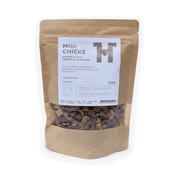 Mini Chicks are a very popular training treat. They are made from dried chicken meat, nothing else. Crispy and crunchy treats that will quickly become a dog's favorite.