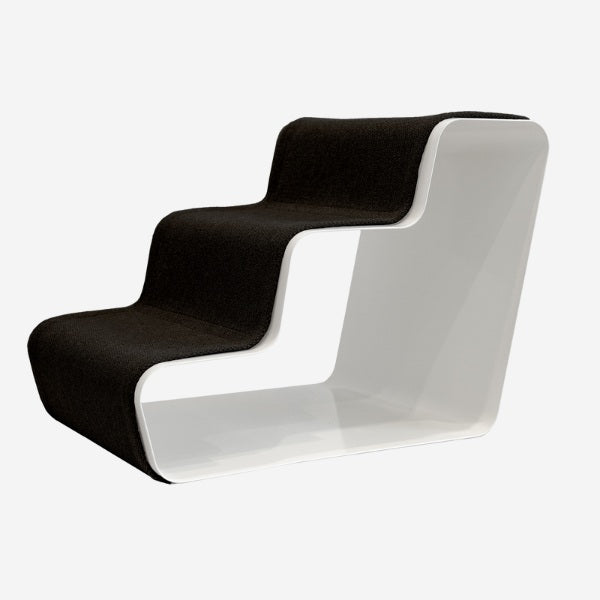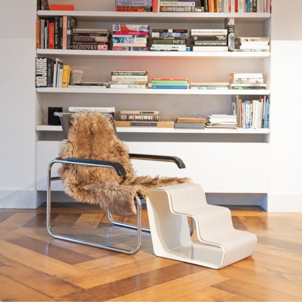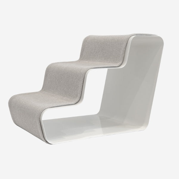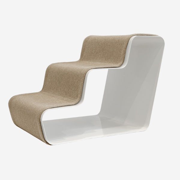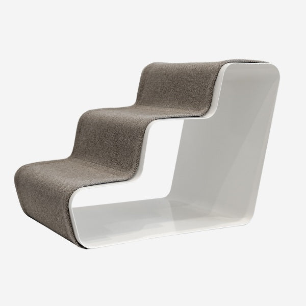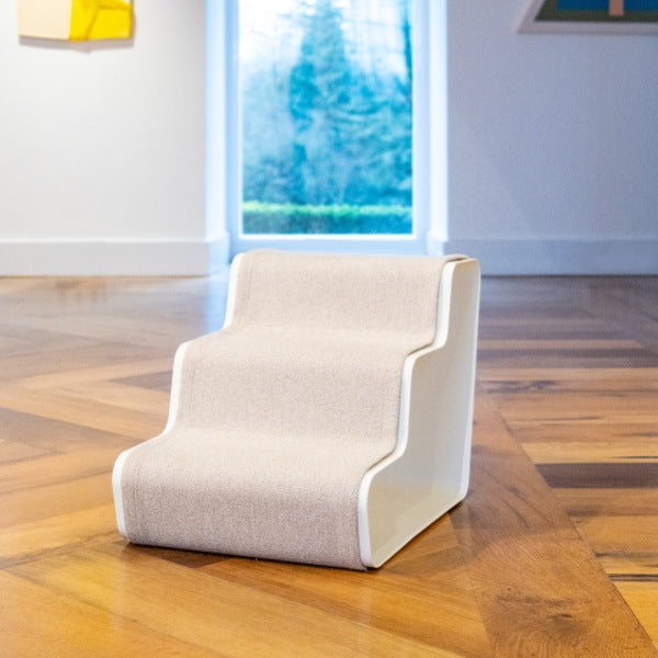 Hundetrappen er lavet i pulverlakeret stål med betræk lavet af genbrugte PET-flasker, som både er aftageligt og vaskbart. Hundetrappen har gummifødder, så den står fast, selv på glatte overflader.