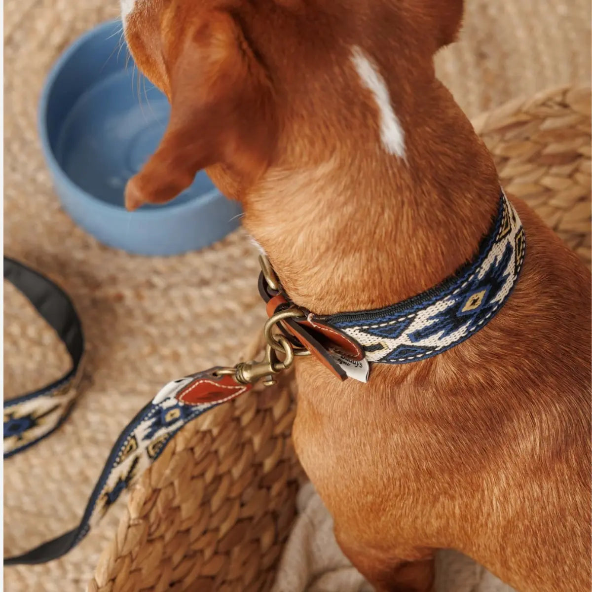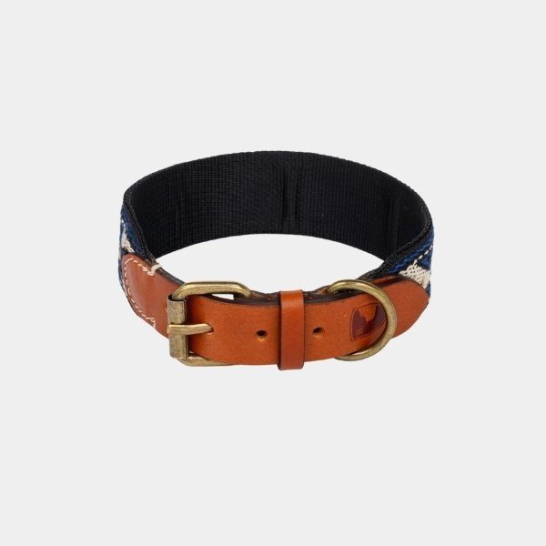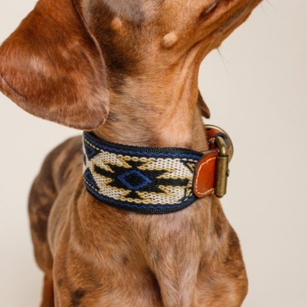 Elegant og let halsbånd fremstillet af de fineste materialer. Halsbåndet giver et lækker boheme udtryk med vintage canvas og lækre mønstre, og ægte italiensk læder. Lette metalspænder med en mat overflade fuldender looket.