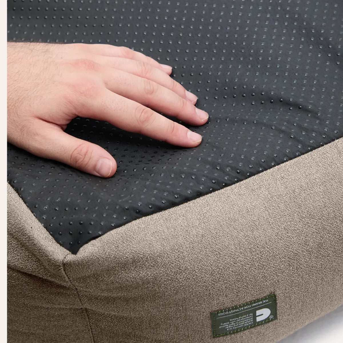 En virkelig komfortabel og holdbar hundeseng – designet i Barcelona og produceret i Europa. Stoffet har en blød og behagelig overflade, der adskiller sig fra de typisk grove senge på markedet. Fyldet består af skumflager, som giver sengen en luftig og blød komfort, og du kan nemt tilpasse mængden af fyld, så sengen passer præcis til din hunds størrelse og behov – uanset om din hund foretrækker at ligge blødt eller mere fast.