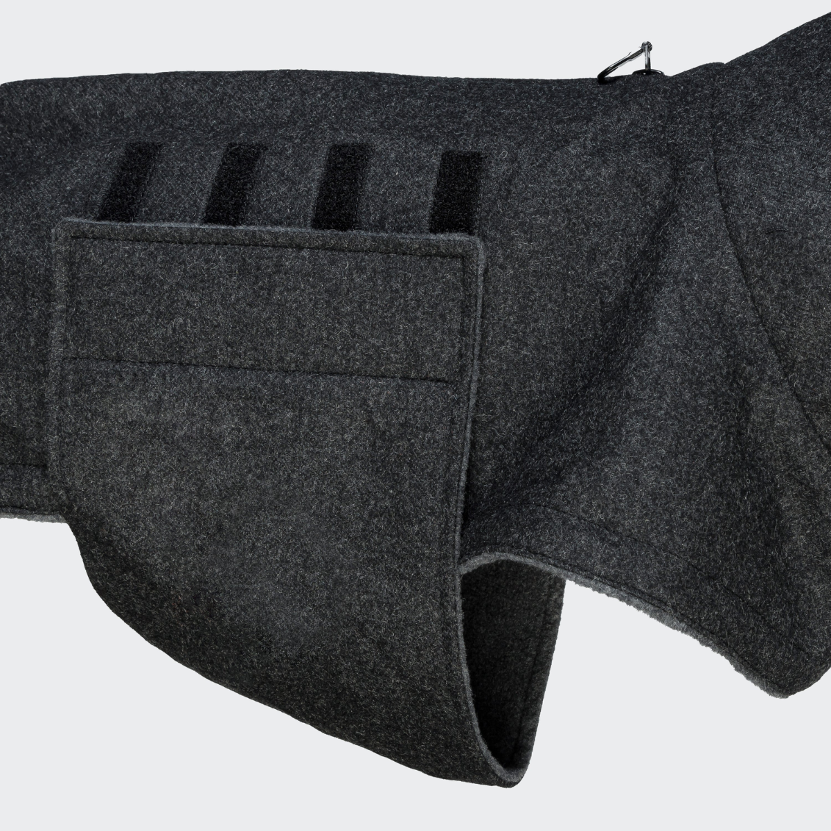 Skræddersyet hundejakke til de lange og slanke kropsformer hos mynder som fx whippets og greyhounds. Varm fleece kombineret med et yderlag i elegant antracit, fremstillet af en særdeles vandafvisende uldblanding. Velegnet til alle mynder og myndeblandinger.
