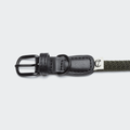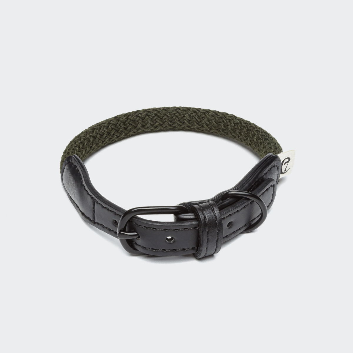 Moderne og bæredygtigt halsbånd. Kombinationen af blødt sort, vegansk kaktuslæder og olivengrønt bomuldsreb med matte, sorte stål-detaljer giver et stilrent udtryk.