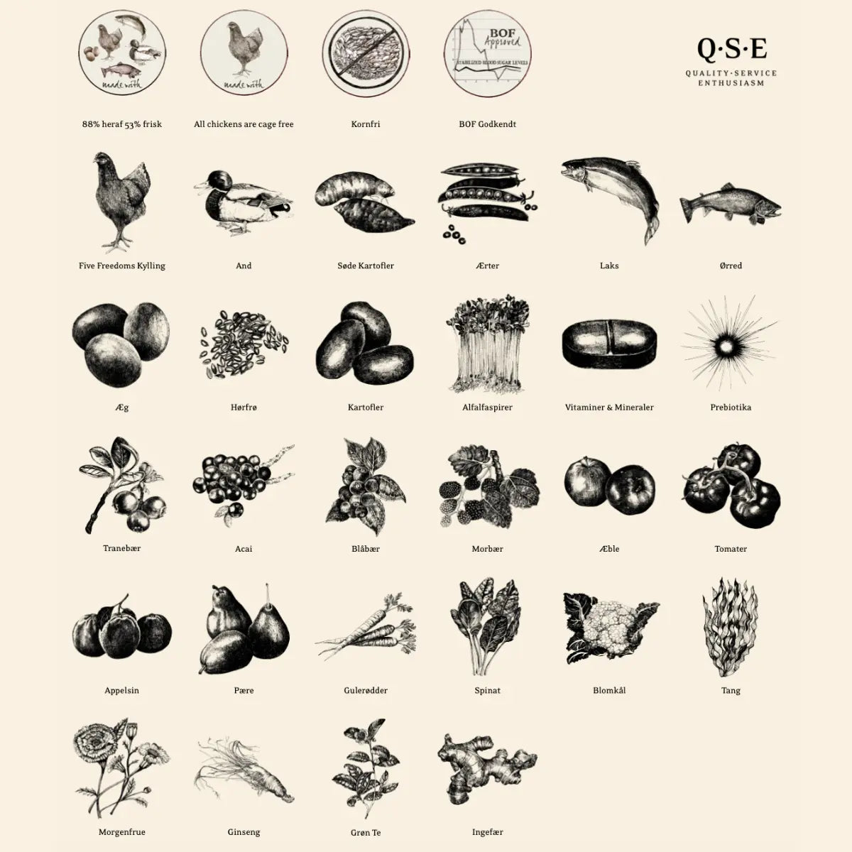 Frisk tilberedt kylling & and, tørret kylling & and, sød kartoffel, kyllingefedt, ærter, frisk tilberedt laks & ørred, hele æg, hørfrø, kartoffel, leverfond, lucernespirer, vitaminer & mineraler, MOS (mannan oligosaccarides), FOS (fructooligosaccharides), glukosamin, kondroitin, tranebær, acai, europæiske blåbær, morbær, æble, tomat, appelsin, pære, gulerod, spinat, blomkål, tang, morgenfrue, ginseng, grøn te, ingefær.