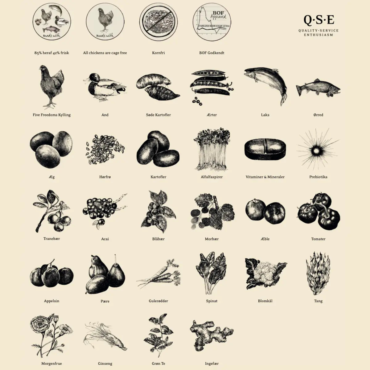 Frisk kylling & and, tørret kylling & and, sød kartoffel, kyllingefedt, ærter, frisk laks & ørred, friske hele æg, hørfrø, kartoffel, leverfond, lucernespirer, vitaminer & mineraler, MOS (mannan oligosaccarides), FOS (fructooligosaccharides), glukosamin, kondroitin, MSM (metylsulfonylmetan), tranebær, acai, blåbær, morbær, æble, tomat, appelsin, pære, gulerod, spinat, blomkål, tang, morgenfrue, ginseng, grøn te, ingefær.