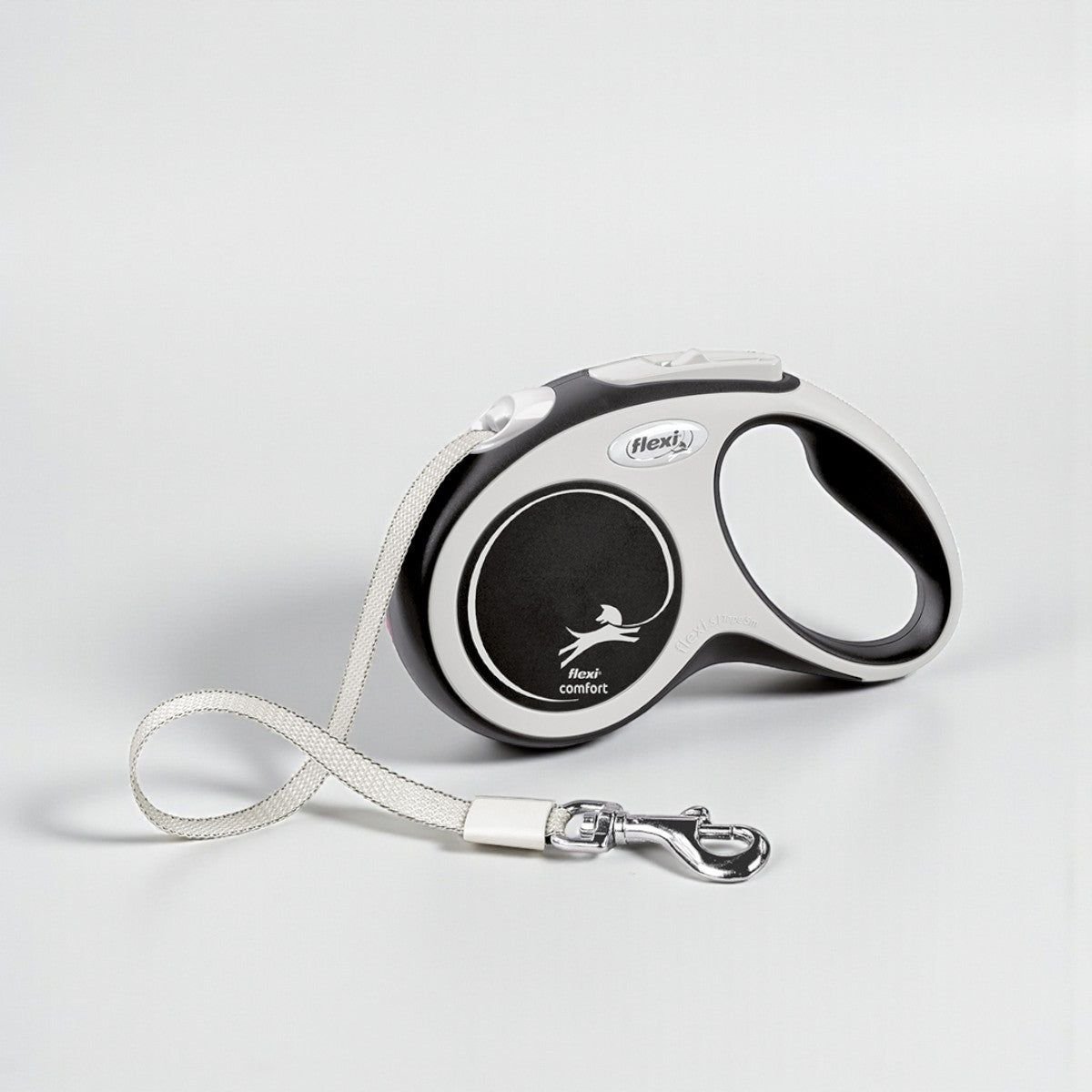 Alle vores flexliner er med bånd fremfor snor da denne holder bedre og er mere sikker. Flexi comfort har hvidt bånd.