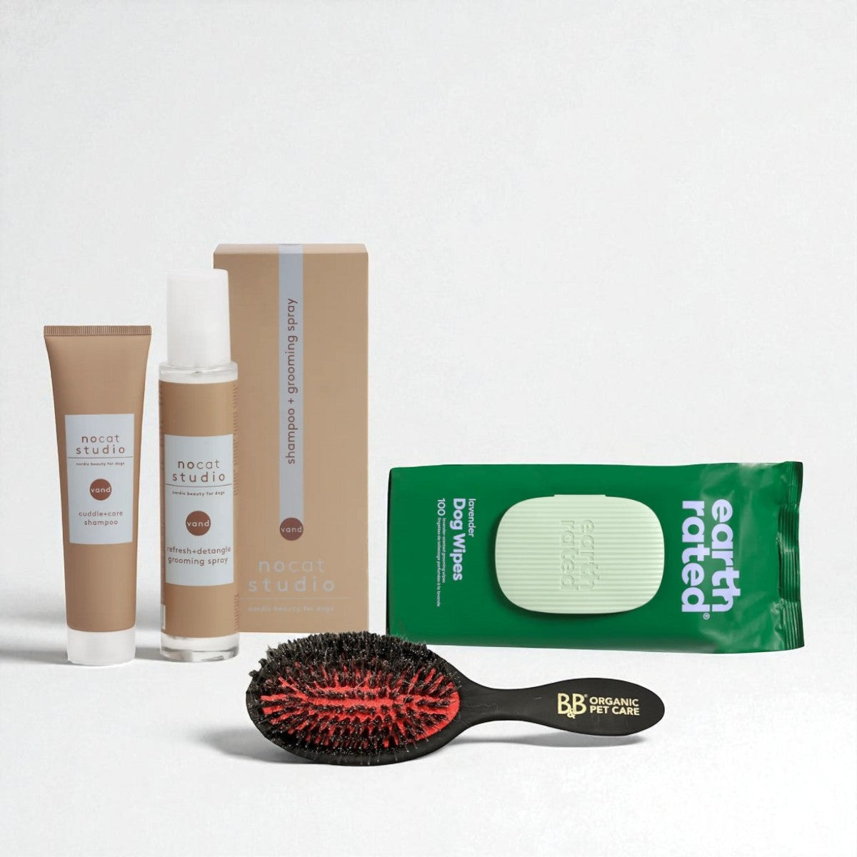 Pakken indeholder et shampoo- og balsamsæt fra Nocat Studio, der giver en mild og nærende vask, samt bløde vådservietter med lavendel fra Earth Rated – ideelle til hurtig rengøring af poter og pels i hverdagen. Dertil kommer B&B’s favoritbørste, som er særligt skånsom og giver en flot glans til pelsen.