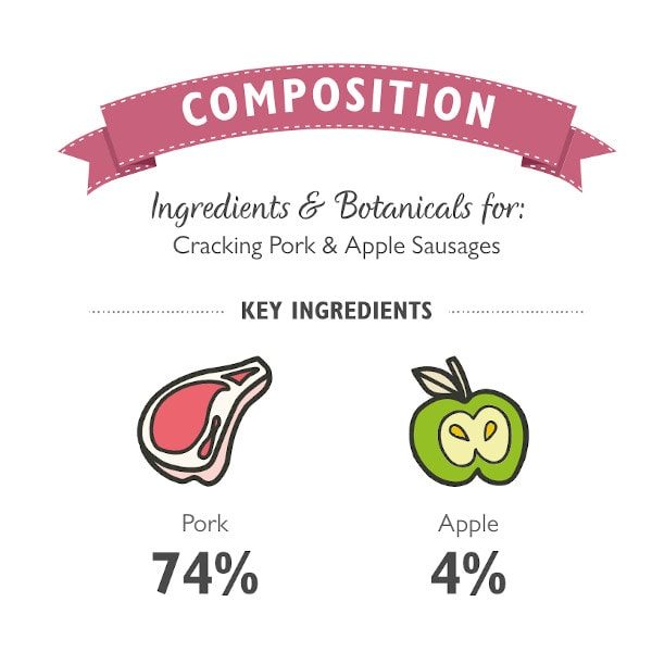 74 % frisk tilberedt svinekød, ærteprotein, vegetabilsk glycerin (rapsolie), æble (4 %)