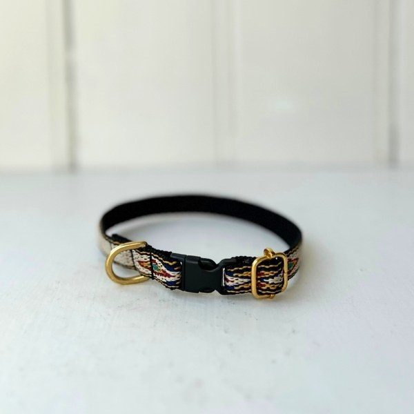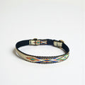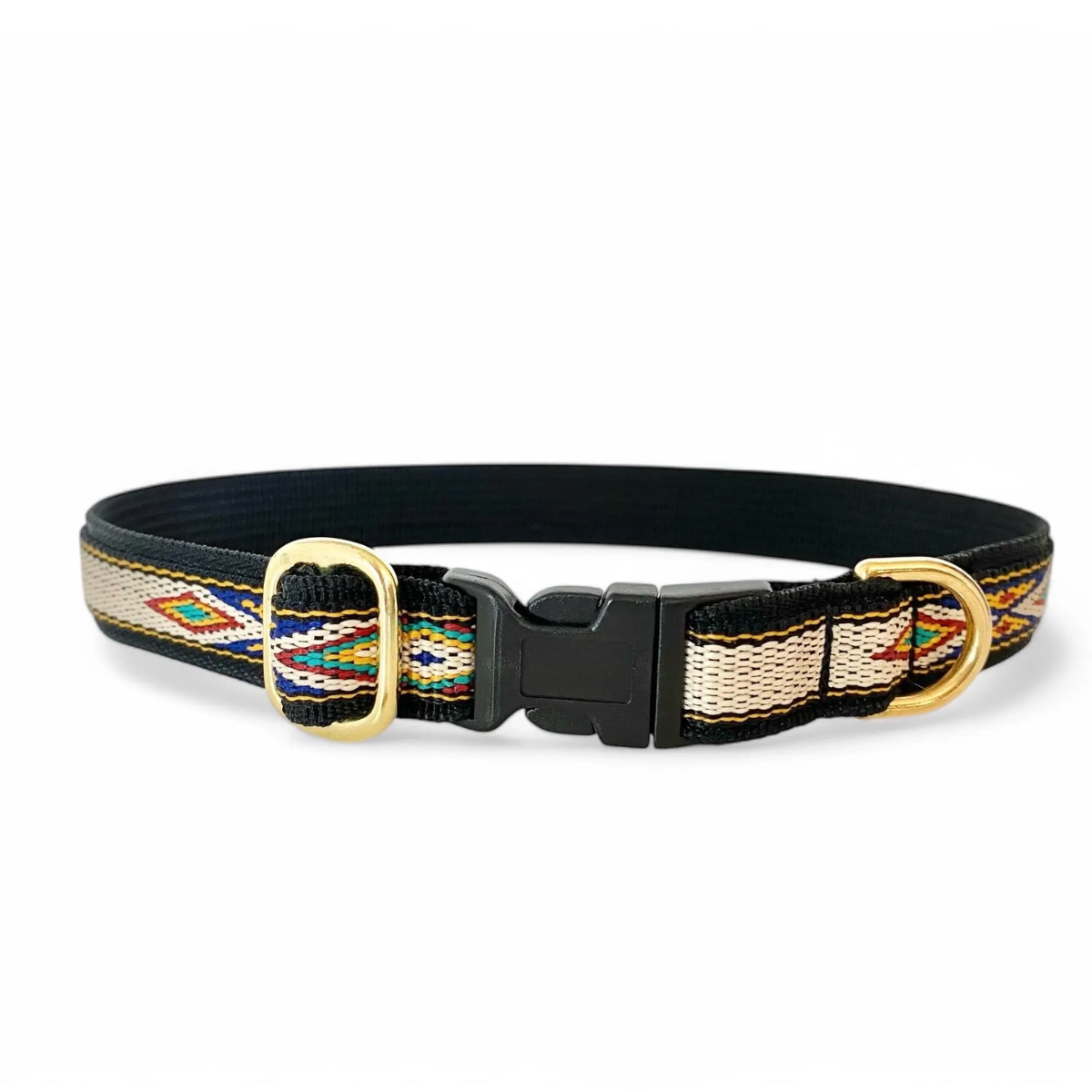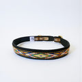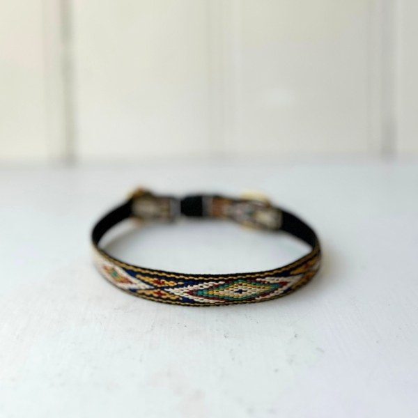 Smukt og unikt halsbånd til små og mellemstore hunde, vævet i et boheme-mønster med messingringe, justerspænde og klikspænde i sort plastik.