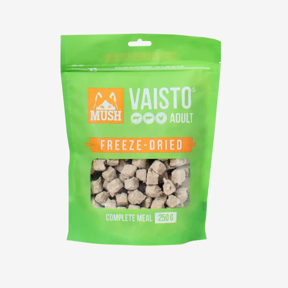 Vaisto Grøn frysetørret er en frysetørret version af barf Vaisto grøn. Et mildt og velsmagende fuldfoder til voksne hunde, der indeholder lidt mindre ben og mere kallun, hvilket også gør den velegnet til hunde med sart mave og ældre hunde med langsommere fordøjelse.