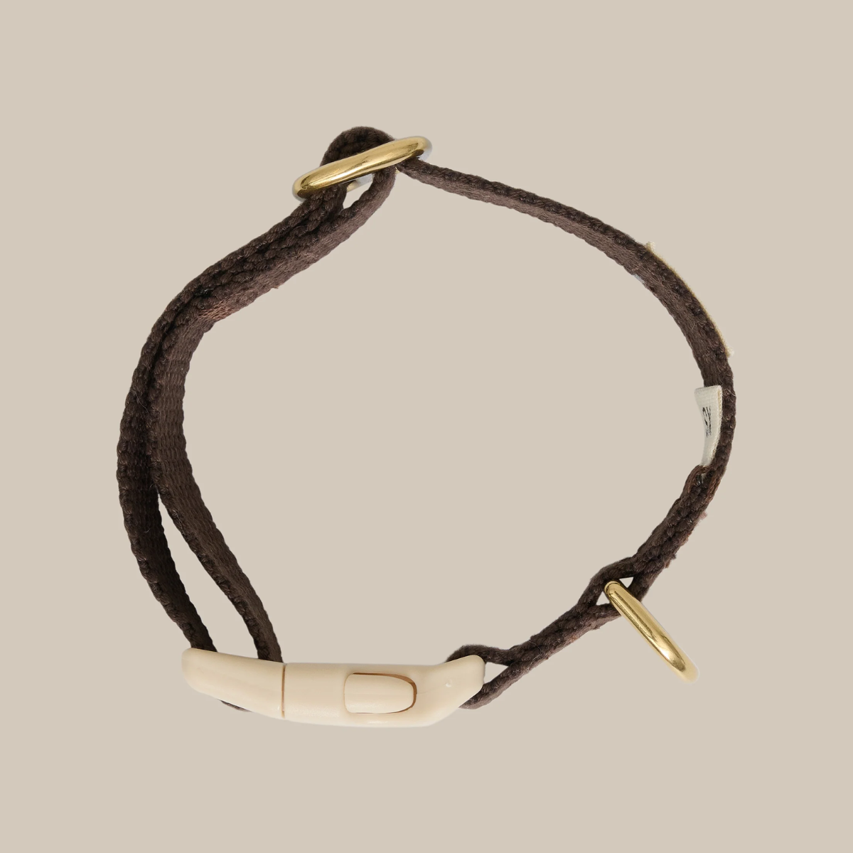 Halsbåndet har spænder i plastik og hardware i forgyldt krom.