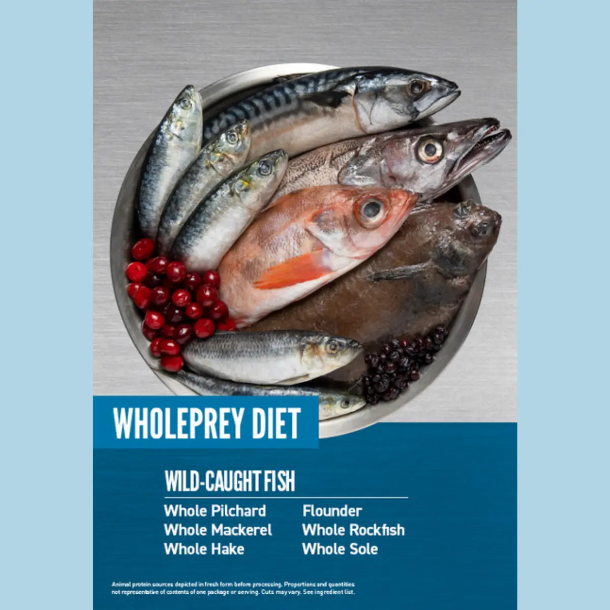 Rå hel sardin (18 %), rå hel makrel (11 %), rå hel kulmule (10 %), rå skrubbe (6 %), rå hel stenbider (6 %), rå hel tunge (6 %), dehydreret makrel (5 %), dehydreret sild (5 %), dehydreret hvidfisk (5 %), dehydreret sardin (5 %), dehydreret blåhvilling (4 %), sildeolie (4 %), hele røde linser, hele ærter, hele kikærter, hele grønne linser, linsefibre, hele pinto-bønner, ærtestivelse, solsikkeolie, tørret tang, frisk græskar, frisk butternut squash, frisk courgette, frisk gulerod, frisk æble, frisk pære, tørret cikorierod, frisk grønkål, frisk spinat, frisk rødbedeblade, frisk majroe, hele tranebær, hele blåbær, hele saskatoonbær, gurkemeje, marietidsel, burrerod, lavendel, lægestokrose, hyben.