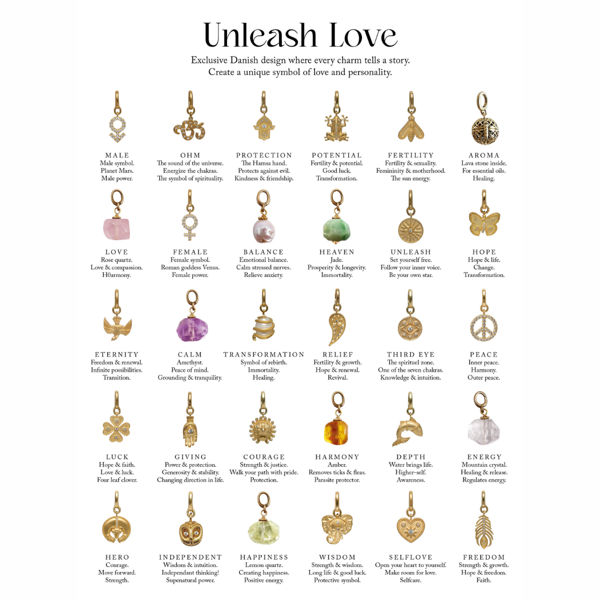 Kollektionen er designet til at styrke og fordybe forbindelsen mellem dig og dem omkring dig, og hvert vedhæng bærer en intention, der kan mærkes. Alle elementer kan mikses, matches og kombineres, så du kan skabe et personligt udtryk, der fortæller din helt egen historie.