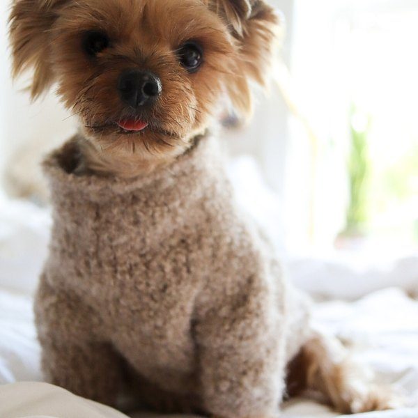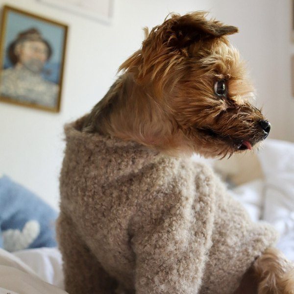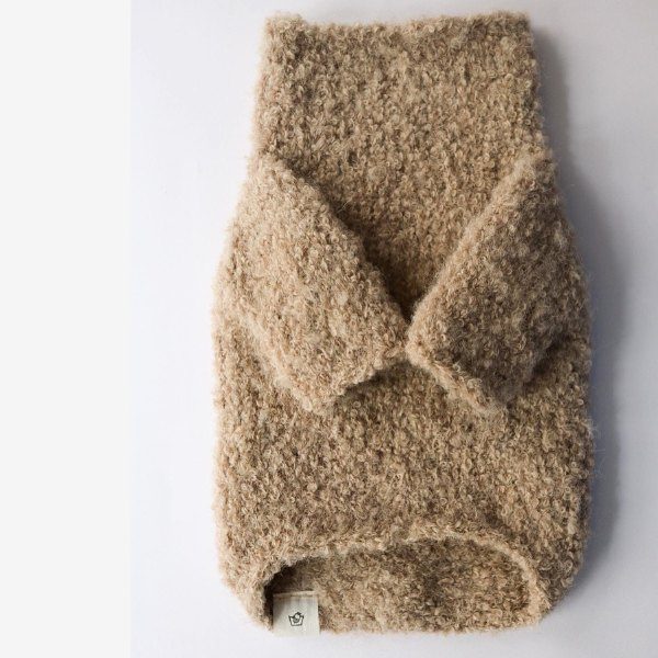 Sweateren er lavet af varmt alpaca-bouclé-garn, som er fleksibelt og strækbart. Den har rullekrave og korte ærmer til forbenene, så du er sikker på at din vuf er varm og komfortabel.